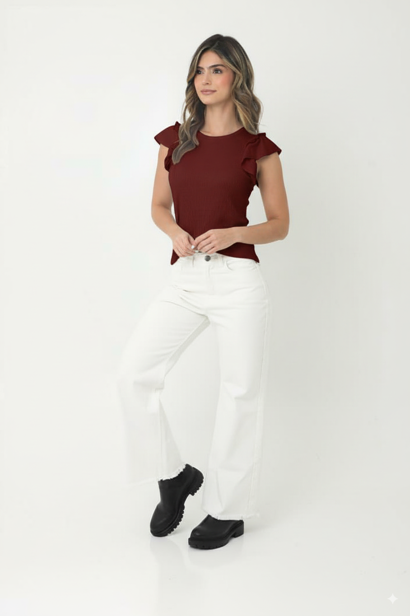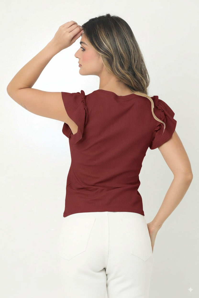 Blusa para mujer en tono rojo, con un diseño delicado y femenino gracias a su bolero sobrepuesto en la sisa al corte, que aporta movimiento y un toque romántico a la prenda. El cuello redondo clásico equilibra el diseño, logrando una pieza versátil y elegante. Su tela en poliéster es ligera, fresca y de fácil cuidado, ideal para mantener un look pulido durante todo el día. Esta blusa combina sofisticación y comodidad, perfecta para elevar un outfit tanto casual como formal.