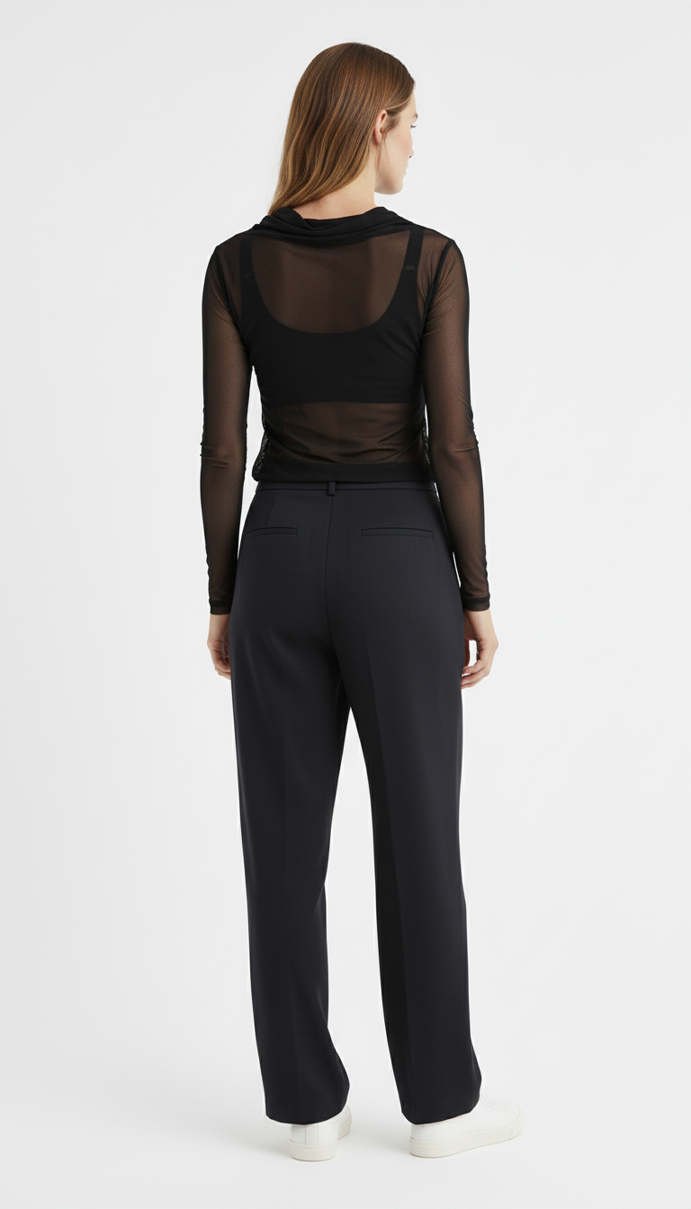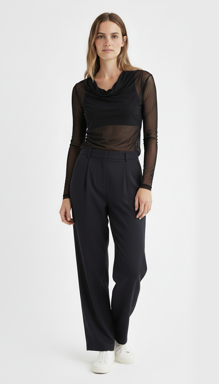 Blusa para mujer en color negro, confeccionada en tela malla con cuello alto y manga larga. Su diseño sofisticado combina elegancia y modernidad, ideal para usar sola o como prenda de complemento en looks nocturnos o urbanos.