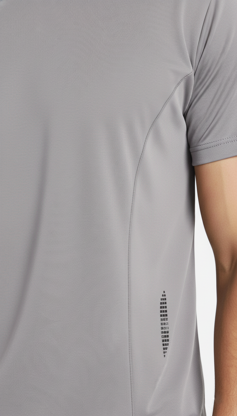 Camiseta deportiva para hombre en gris con cuello redondo, cortes delanteros y detalles reflectivos en el frente que mejoran la visibilidad. Confeccionada en 100% poliéster, su material transpirable asegura frescura y libertad de movimiento, ideal para entrenamientos intensos.