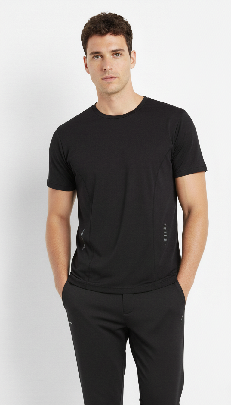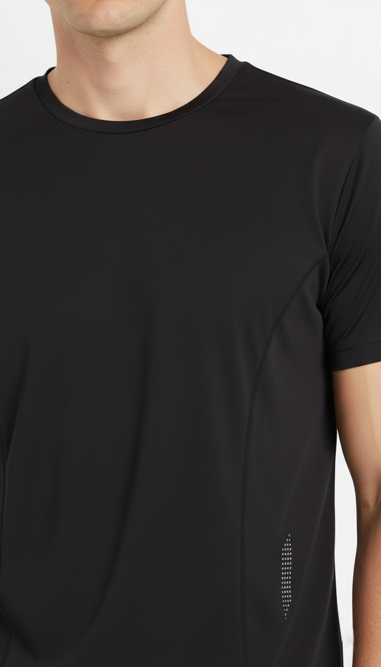 Camiseta deportiva negra de manga corta con cuello redondo. Diseño moderno con cortes delanteros y detalles reflectivos en el frente, ideal para destacar durante tus entrenamientos. Confeccionada en 100% poliéster, ofrece ligereza, transpirabilidad y comodidad para cualquier actividad física.