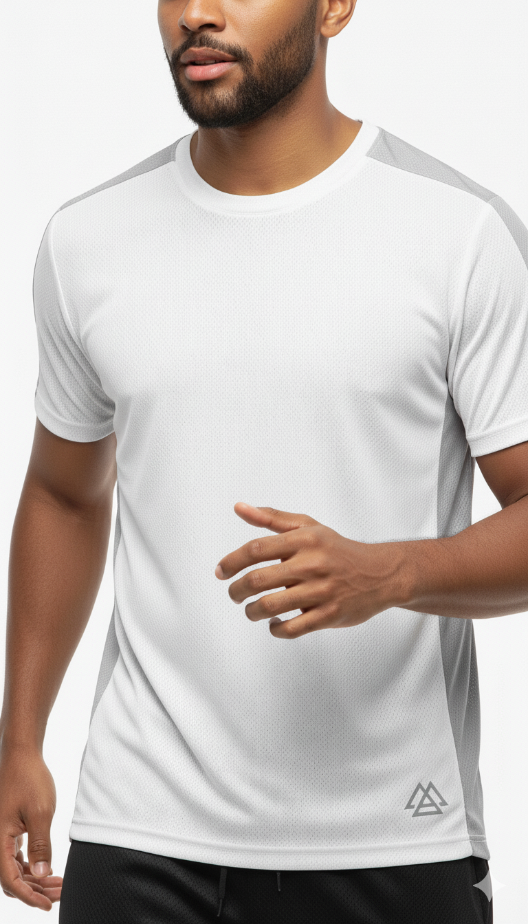 Camiseta deportiva de manga corta blanca con cuello redondo y bloques que aportan estilo y ventilación. Confeccionada en 100% poliéster, es ligera, cómoda y perfecta para mantenerte fresco durante tus entrenamientos o actividades al aire libre.