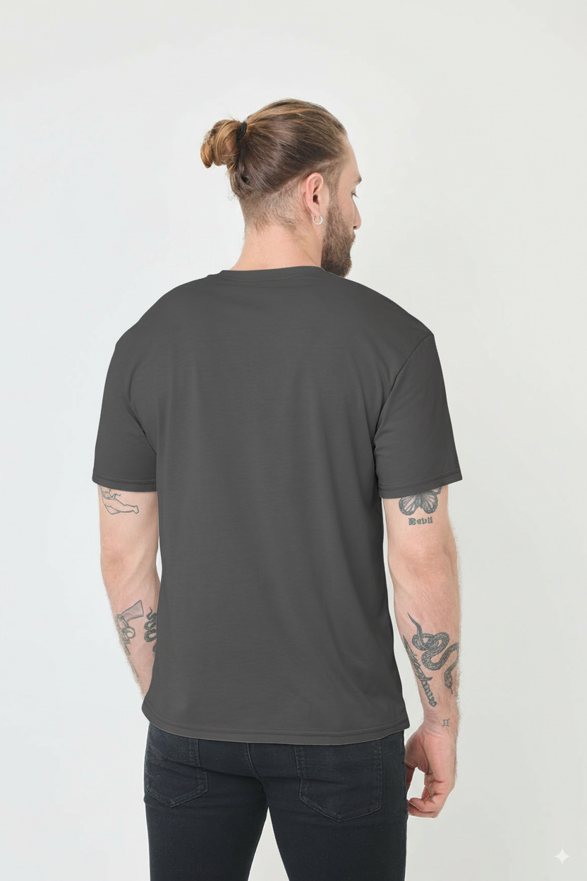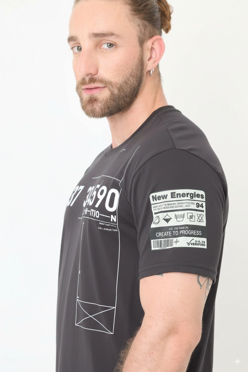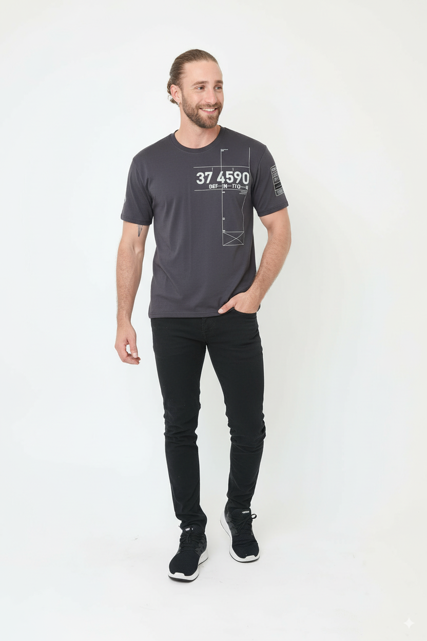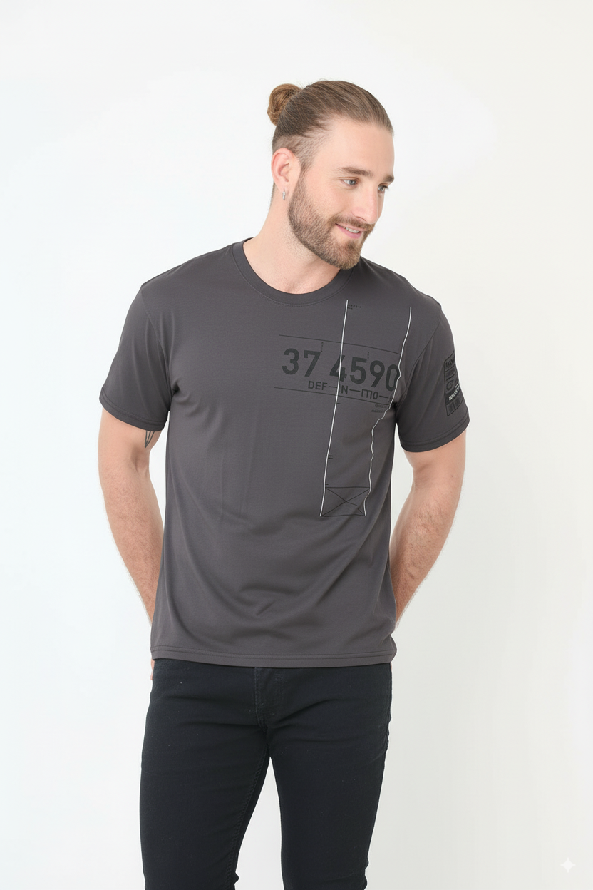 Camiseta para hombre de manga corta en color gris, con cuello redondo clásico y estampado moderno en el frente y en una de las mangas, que le da un estilo único. Su silueta cómoda permite total libertad de movimiento, convirtiéndola en una prenda ideal para el día a día. El tejido en mezcla de poliéster y algodón aporta frescura, suavidad y resistencia, manteniendo la prenda ligera y fácil de cuidar.