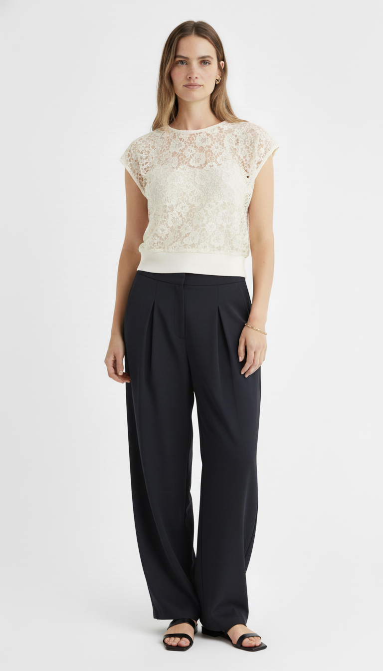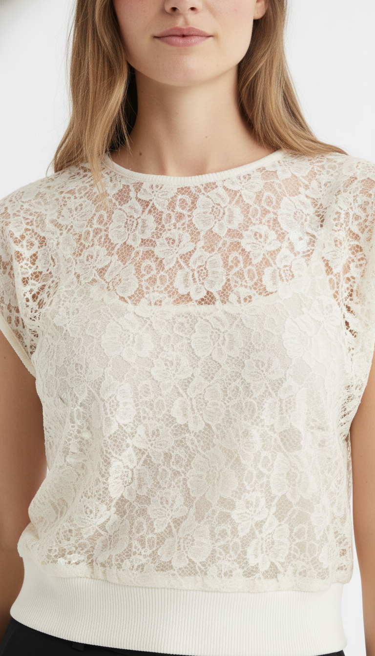 Camiseta manga sisa para mujer en color ivory, elaborada en encaje con fajón en el ruedo que aporta definición y estilo. Su textura delicada y diseño elegante la convierten en una prenda ideal para crear looks femeninos y sofisticados sin perder comodidad.