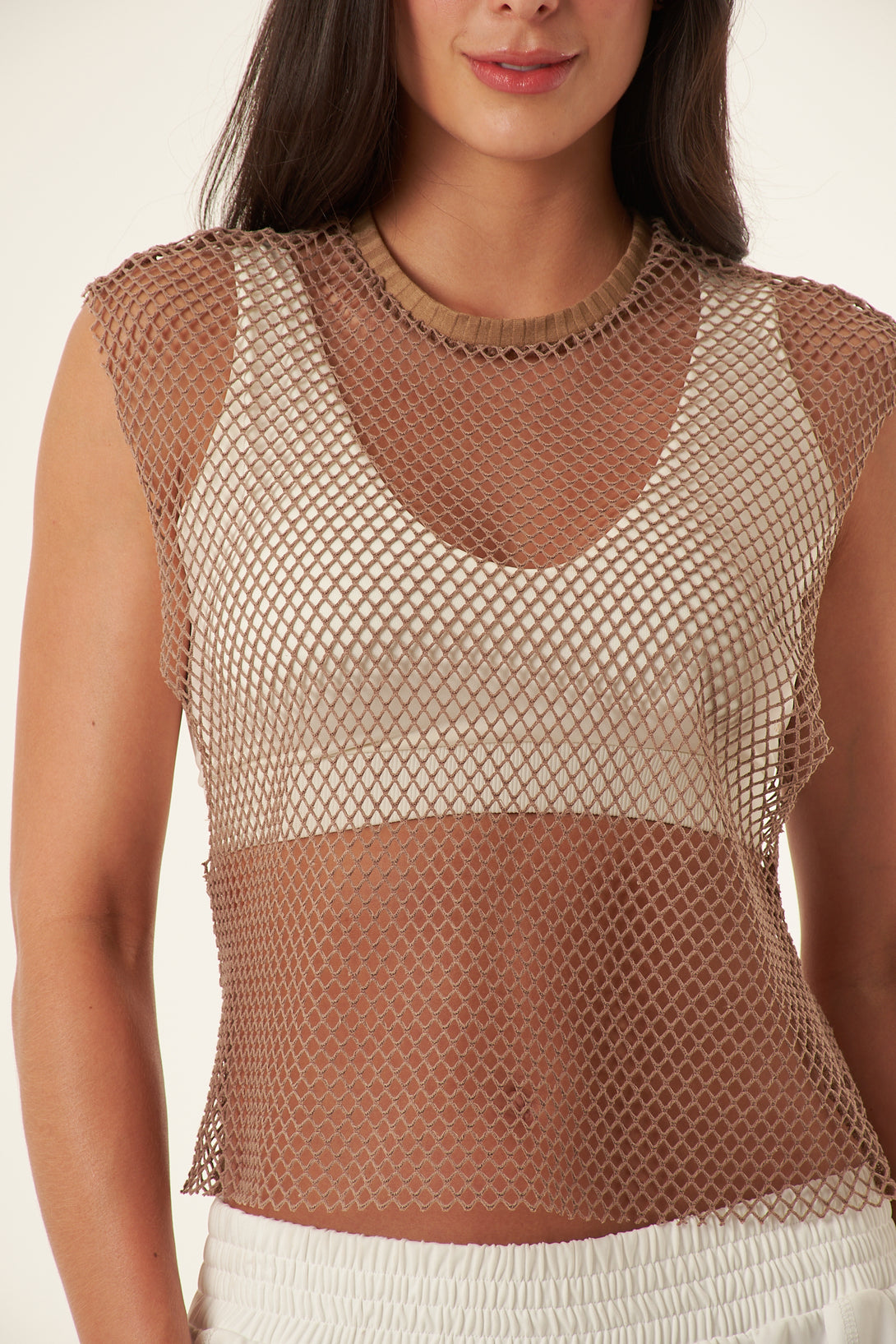 Camiseta manga sisa color café que combina frescura y estilo en cada uso. Su diseño en tela malla permite mayor transpirabilidad, mientras que el cuello redondo en tejido de punto aporta suavidad y confort.