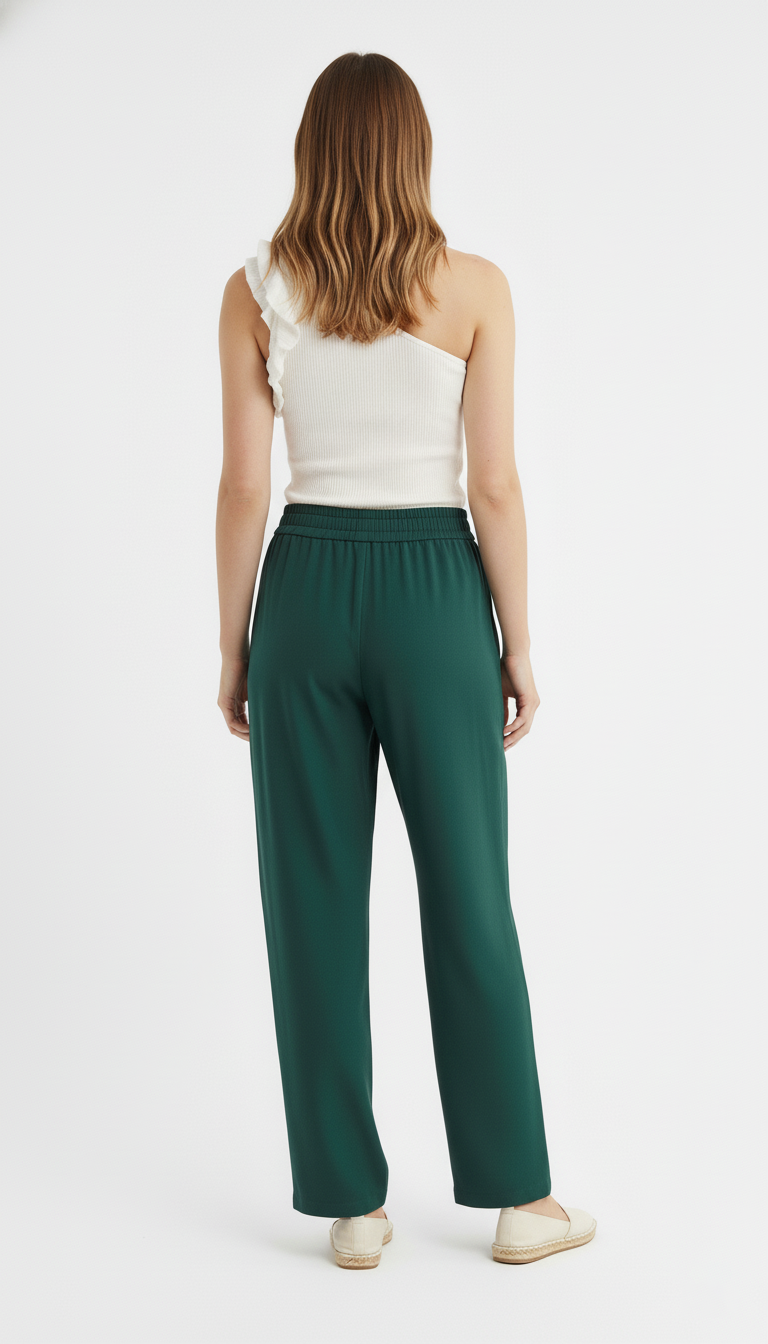 Pantalón para mujer en color verde, con silueta amplia, bolsillos funcionales y tablas frontales que aportan estructura. Su cintura combina parte delantera lisa con parte trasera resortada para un ajuste perfecto. Hecho en tela ligera, mezcla comodidad y elegancia en una sola prenda.
