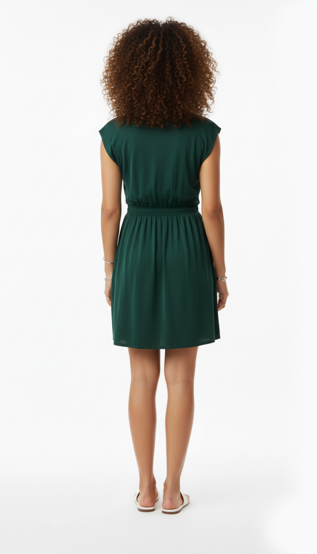 Vestido corto para mujer en color verde, con prenses en los hombros, escote frontal cruzado y cintura elástica que define la silueta. Su diseño combina frescura y elegancia, ideal para lucir un estilo natural y sofisticado. Hecha en tela ligera y fluida para máxima comodidad.
