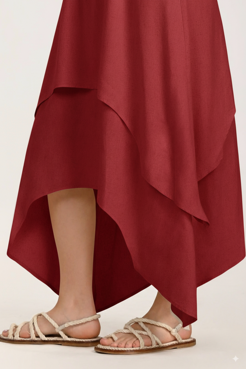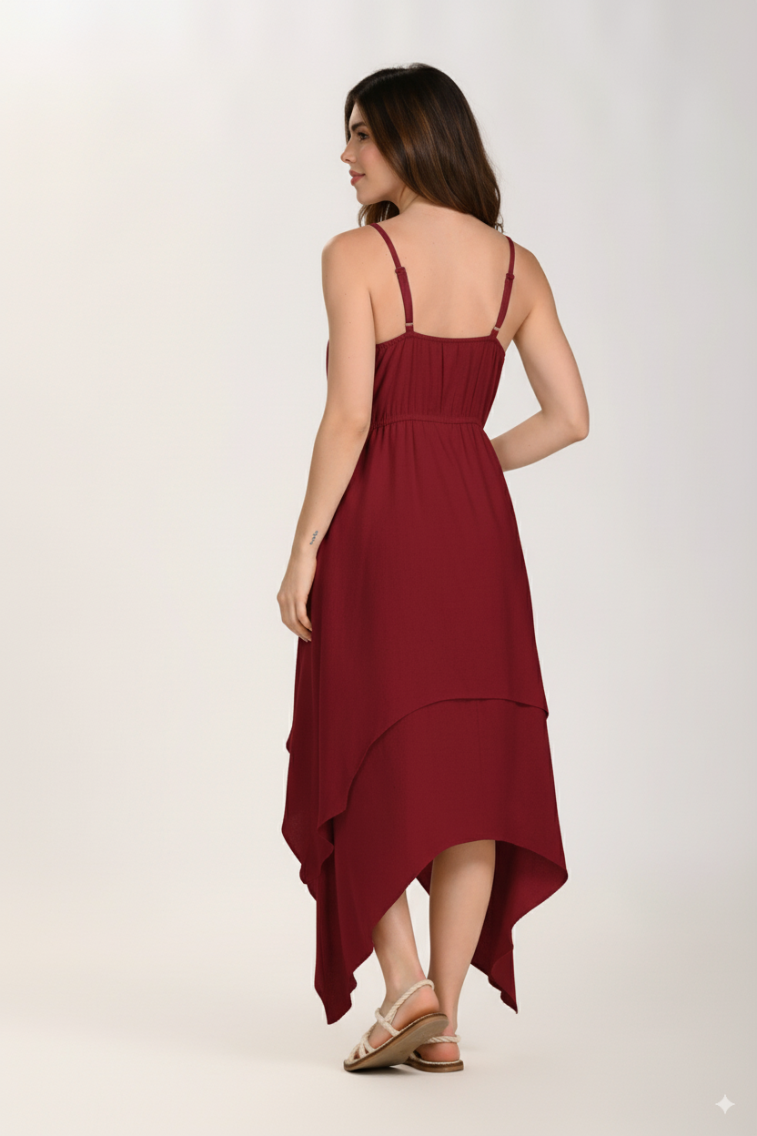 Vestido largo para mujer en color rojo, con delicadas cargaderas y caída fluida que aporta movimiento y frescura. Elaborado en tela suave y ligera, perfecta para climas cálidos y para lograr un look natural y relajado.