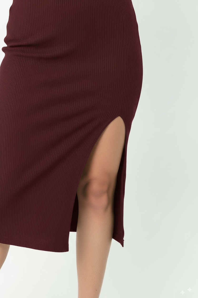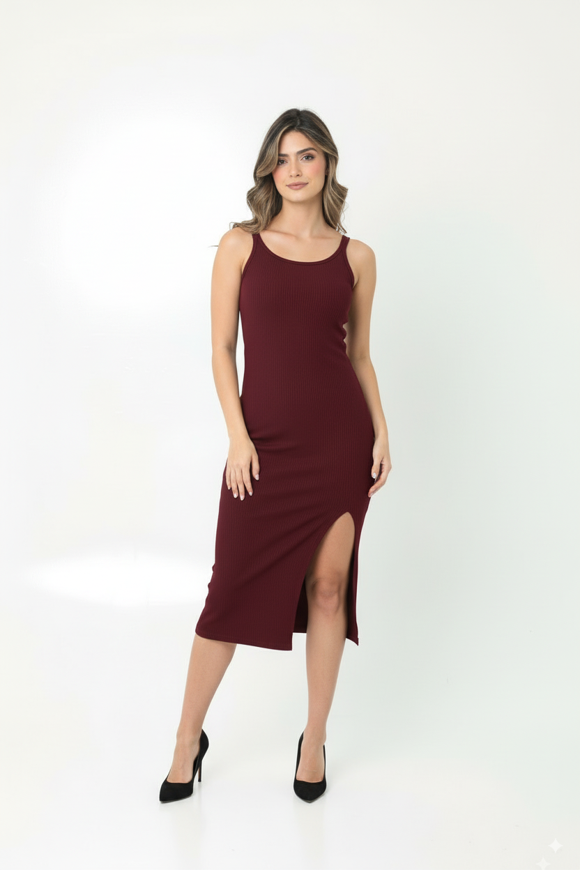 Vestido largo vinotinto manga sisa segada, con abertura frontal con terminación al corte para mujer