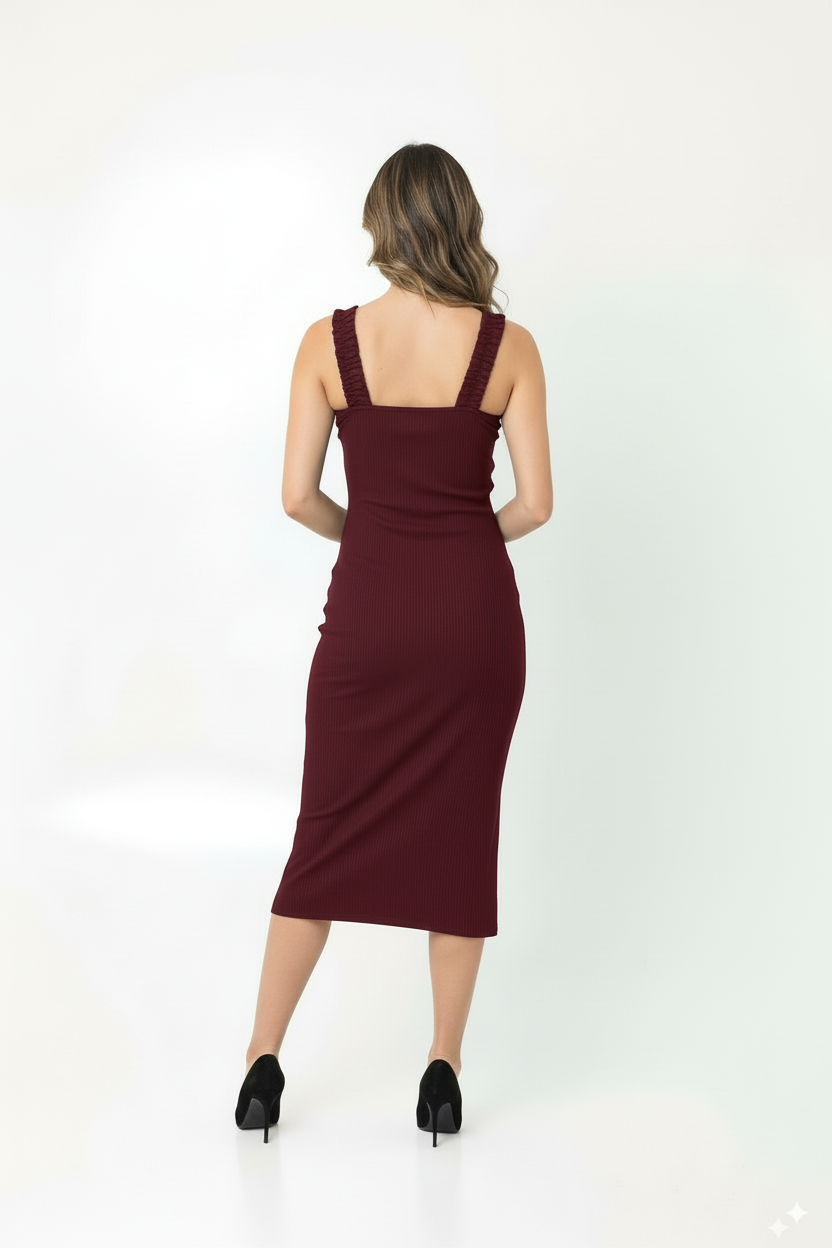 Vestido para mujer largo, cargadera elásticas forradas en la misma tela, escote redondo sesgado, manga sisas sesgadas, abertura frontal con terminación al corte. Silueta semi-ajustada.